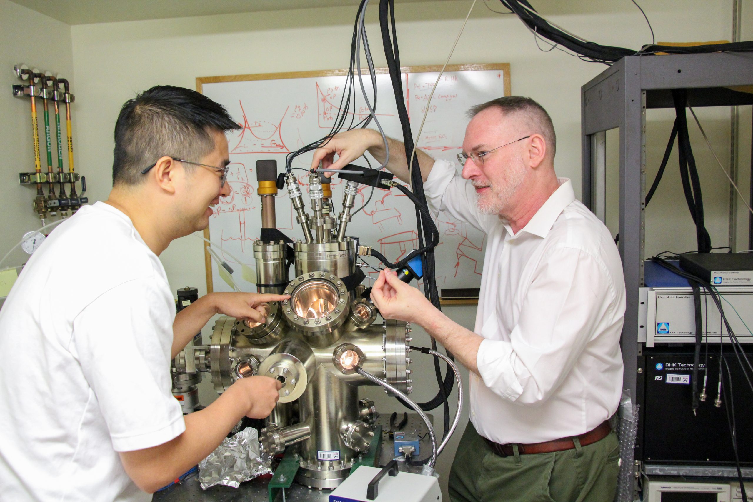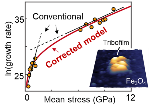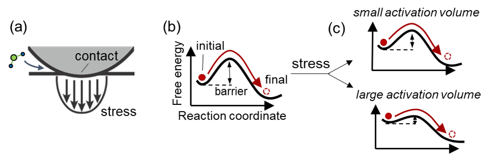 Cracking the Code of Force-Driven Chemistry In the News, Research + Innovation / July 17, 2025 Share: Author: Melissa Pappas When asked to think of a chemical reaction, you might picture bubbling liquids in a beaker, or maybe applying heat to a mixture until something transforms. But some of the most important reactions in nature and industry don’t need heat or solvents. Instead, they need force. Mechanochemistry is where physical pressure or stress triggers chemical reactions. Imagine molecules being rammed together like bumper cars, or shaken up in a giant cocktail shaker. That shaking and colliding happens every day inside car engines, manufacturing equipment and experimental green reactors. But until recently, scientists have struggled to explain exactly how these force-fueled reactions happen or how to make them work better. At Penn Engineering, the laboratory of Robert Carpick, John Henry Towne Professor in Mechanical Engineering and Applied Mechanics (MEAM), was looking at this issue as members of the Center for the Mechanical Control of Chemistry, a National Science Foundation-funded Chemical Center of Innovation that aims to transform the understanding and adoption of mechanochemistry. Now, Carpick, along with Cangyu Qu, postdoctoral researcher, and Lu Fang, a former Ph.D. student in the Carpick lab, has developed a theoretical model that overcomes previous challenges in accurately describing the relationship between mechanical stress and chemical reactions. Their recent study, published in APS’ Physical Review B, fills in the gap for describing the forces that occur when molecules are squeezed between two surfaces. This result helps make it easier to predict mechanochemical reactions, which are promising for the green manufacturing of plastics, metallic compounds, lubricants and more. Cangyu Qu (left) and Rob Carpick (right) working with an atomic force microscope to measure mechanochemical reactions occurring in real time. Previous Limitations in Mechanochemistry Scientists have long known that mechanical stress can “activate” chemical reactions, meaning it can lower the energy needed to get molecules to react. But previous efforts to measure a key property called the “activation volume,” which tells us how readily the applied stress changes the energy needed for a reaction to happen, have produced wildly inconsistent results. “Different studies were showing activation volumes that differed by 100-fold,” explains Qu. “This makes it challenging for researchers studying mechanochemistry to interpret these kinds of reactions. We couldn’t reliably determine either the magnitude or the physical meaning of activation volume across different scenarios.” Without an accurate way to measure activation volume, engineers couldn’t confidently predict mechanochemical reactions, impeding the design of better lubricants, cleaner industrial processes or more efficient material synthesis techniques. Mechanochemistry holds promise for greener chemistry — skipping the need for high heat or polluting solvents — but it cannot be a viable option for large-scale synthesis of chemicals or manufacturing of materials without better tools to predict the outcomes. Two Spheres, One Breakthrough To untangle the confusion, the team took a close look at how to measure these reactions in the lab and at the simplest scale possible. They examined what was happening at the point of contact between two spheres: Think ball bearings pushed together, but much smaller. “But the stresses at contacting points aren’t perfectly uniform,” says Carpick. “When two spheres touch, the stress isn’t the same across the whole contacting area. That throws off the math and this conundrum became our first challenge to overcome.” Previous models made assumptions about the stresses and the size of the contact, which led to inaccuracies that could be so large, they would be useless in any optimization study. Carpick’s team developed a new model that corrects for two key issues: First, the stress across the contact isn’t uniform, and second, as you press the spheres harder together, the area of contact changes, which affects how many molecules are actually reacting. A sphere comes into contact with a surface (a) creating non-uniform stress distribution at the contact points. This stress lowers the energy barrier required to catalyze the reaction (b). The extent of this barrier reduction depends on the activation volume (c): with a small activation volume (top), the effect is modest; with a large activation volume (bottom), the barrier drops significantly, allowing the reaction to happen easier. By incorporating both of these factors, the researchers produced a model that lines up neatly with real-world data, resolving longstanding discrepancies between micro-scale and nano-scale experiments. The team’s experimental data shows how a protective film (called a “tribofilm”) is grown on an iron oxide surface when stress is applied, a mechanochemical reaction important in the automobile industry. The conventional model (in black) cannot explain the data consistently and correspond to different activation volumes. The new corrected model captures the data coherently and corresponds to a single and accurate activation volume. A Simpler System, a Greener Future To validate their model, the team studied reactions in a system called a Hertzian contact, a classic way to describe how round objects touch. Rather than modeling complex industrial equipment directly, they focused on a simpler setup: a spherical tip pressing against a flat surface. That’s a good stand-in for one collision at a time inside something like a ball mill, a real-world mechanical reactor that works kind of like a giant cocktail shaker for molecules. This type of sphere-on-flat contact also represents the basic building block of almost all practical rough surfaces, where contact occurs at many tiny, individual points that close