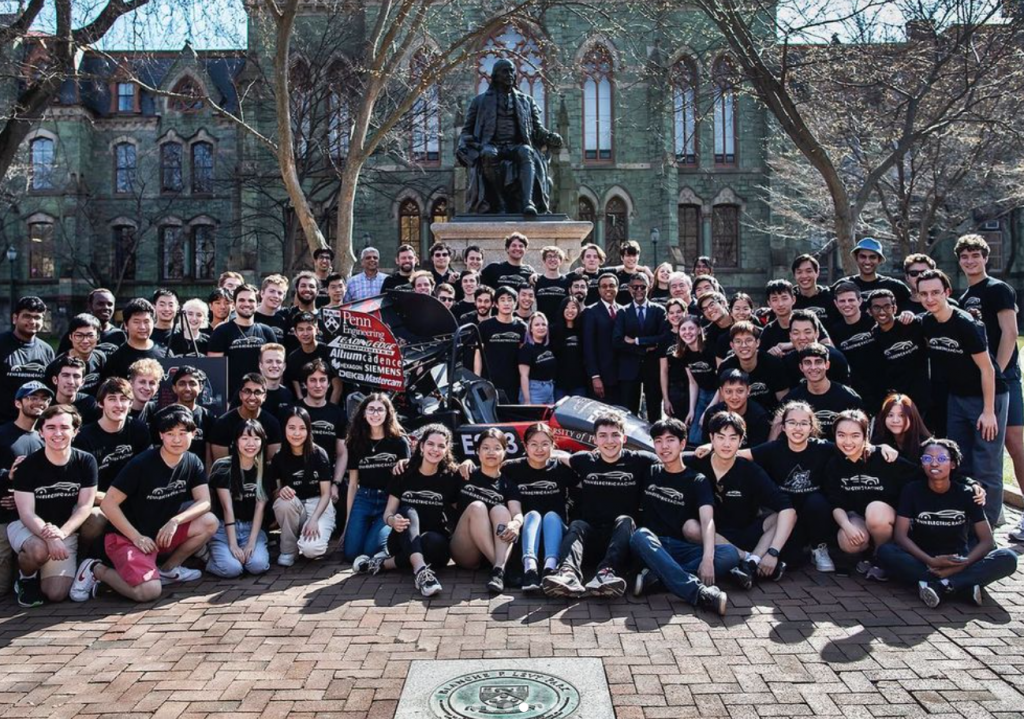 Penn Electric Racing Unveils New REV7 Racecar Despite Pandemic Setbacks Students / March 21, 2022 Share: Author: Matthew Stellato After a two-year hiatus, Penn Electric Racing – the University of Pennsylvania’s Formula Society of Automotive Engineers (FSAE) racecar-building team – has unveiled their latest creation: the REV7. The team, who has earned 39 trophies during their eight years of competing, is slated to bring the REV7 to this year’s FSAE Michigan competition in Brooklyn, Michigan in May. Roughly two years ago to this date, Penn’s campus physically shut down due to the COVID-19 pandemic, and the team was sent home before they were able to finish building their previous REV6 model. They competed in three events for FSAE’s Virtual Competition in May and June of 2020, and then worked completely virtual on REV7’s design for the academic year following. So many of their members ended up graduating during the work-from-home period that the team spent that time essentially designing a brand new car. “We decided that it was best for team sustainability to redesign the car in order to ensure design ownership,” said Leslie Lytle, the team’s Accumulator and Operations Lead. “The pandemic gave us an unusually long time to design the new car, which really allowed us to fully understand every part.” Lytle, a Penn Engineering junior from Alexandria, Virginia majoring in Materials Science and Engineering (MSE), said that when in-person work resumed in September 2021, the machining, manufacturing, and assembling of the car required a unique resourcefulness. The knowledge and guidance that was normally passed down from more senior classmates with previous build experience was largely lost. “The juniors on the team who had designed REV7 had never finished a car before and there were many unknowns in the assembly process due to lack of experience,” said Lytle. “Despite this, we machined about 70 unique parts for the car, learning new manufacturing techniques, and successfully assembled the car you see presented at Unveiling.” Key changes to the design include the switch from REV6’s four-wheel drive to REV7’s two-wheel drive, and the implementation of the team’s first pullrod suspension system. They also made the critical decision to change this year’s design to a rear wheel drive “to ensure that current team members designed every system on REV7 and had a full understanding of how they work”, said Lytle. The switch from four-wheel drive to two meant that the team needed to redesign the battery pack and the powertrain, a composite of parts responsible for using energy stored in the vehicle’s battery system to make the car go. “Our new powertrain assembly features a new Emrax motor, along with custom designed and machined motor housing, uprights, and wheel hubs,” said Lytle. “For our new battery pack, we utilized pouch cells, which increased the pack voltage to 476 volts and increased energy density by 1.5 times compared to previous designs.” Now, with the unveiling in the rearview, the team will focus on getting the electrical and mechanical systems working together so they can extensively test the car before the competition in May. All of Penn Electric Racing’s roughly 70 students pose with University Interim President Wendell Pritchett and Penn Engineering Dean Vijay Kumar (both right of center), surrounding their new racecar, the REV7, at the official unveiling on Friday, March 18. (Photos by Eric Sucar) Read More Decoding a Material’s ‘Memory’ 'Decentralizing Vaccine Manufacture'