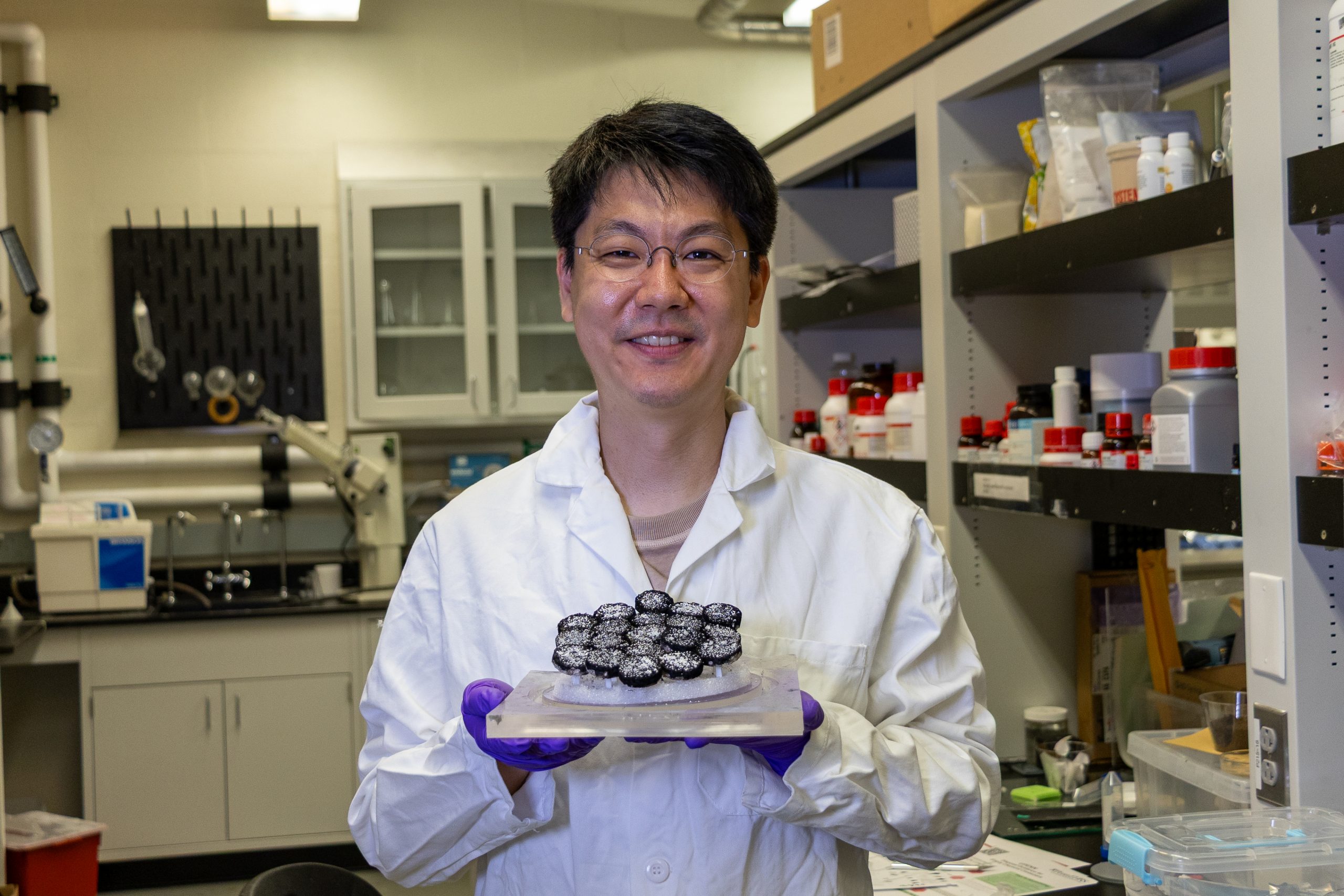 Yunchan Lee holding the sunflower disks inlaid with the raspberry microbeads in an array that provides a proof of concept for this new approach to water harvesting.