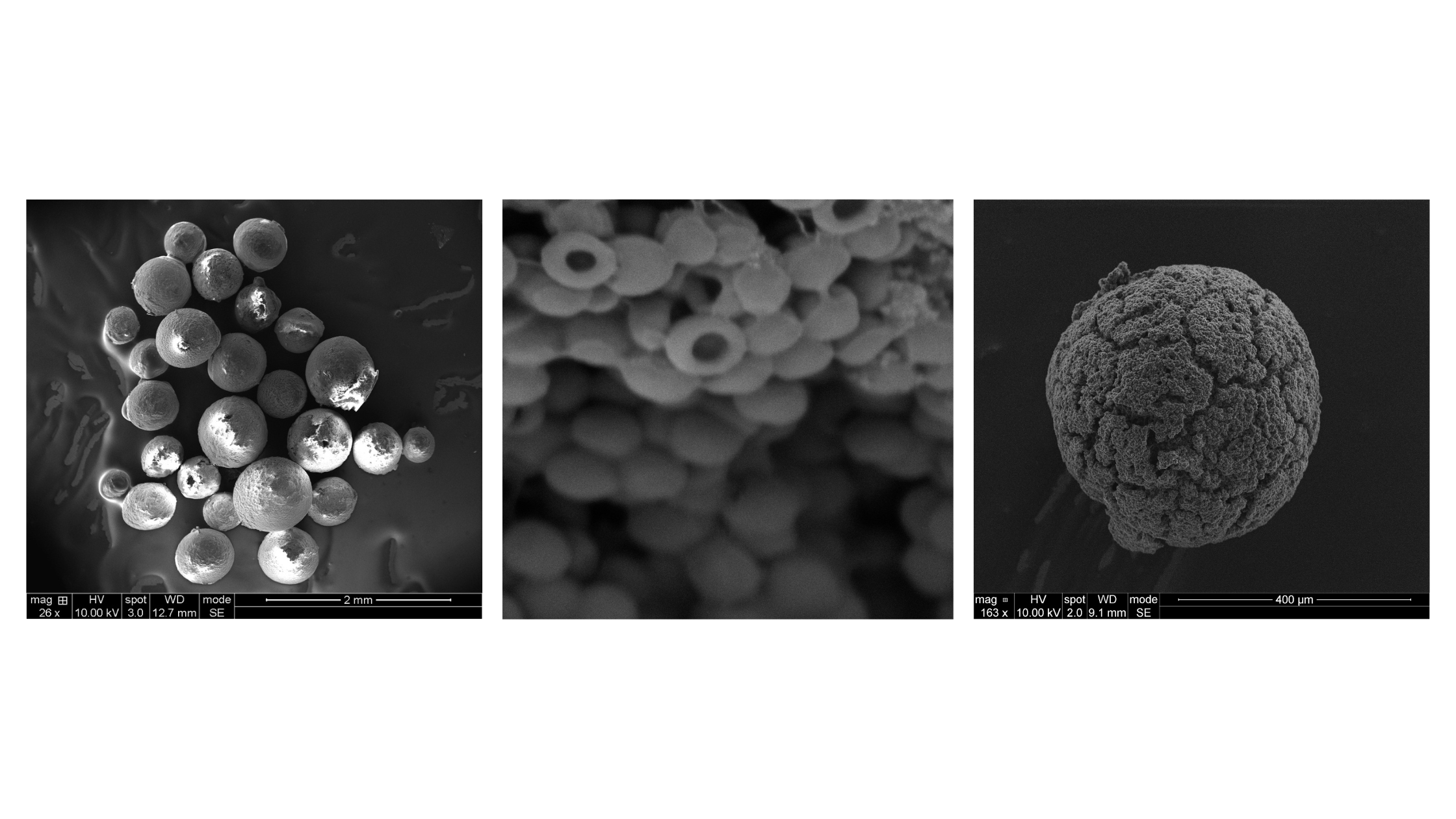 A series of close-up images of the microbeads showcase their irregular and raspberry-like structure.