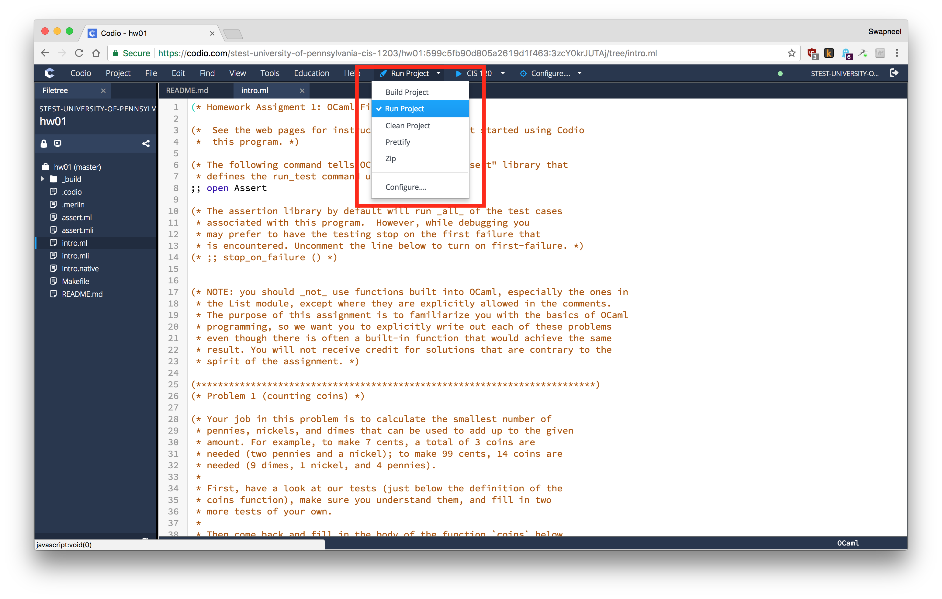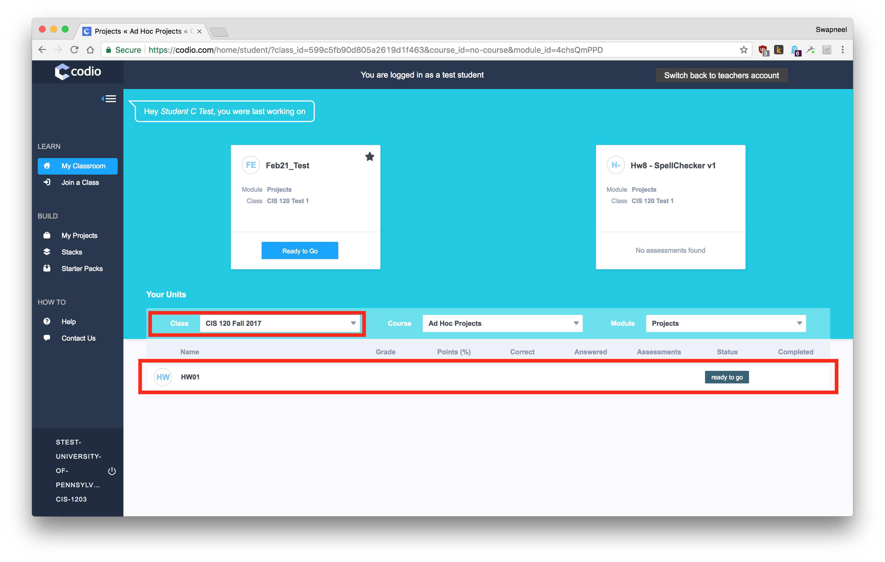 - Once you’re logged in, select the CIS 1200 class and open the appropriate Codio project (e.g. “HW01”). You can see the class and available projects highlighted in red in the screenshot below.