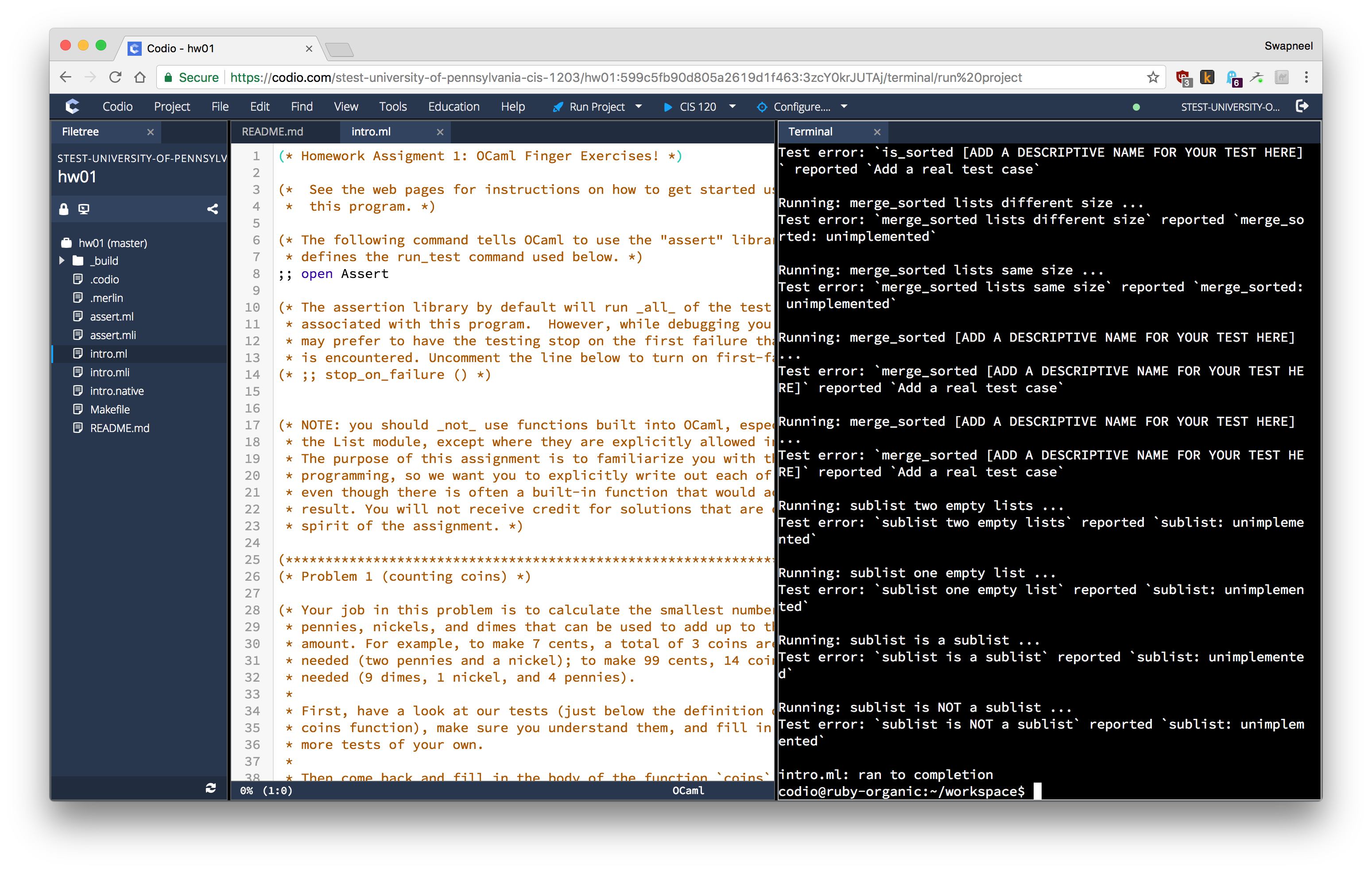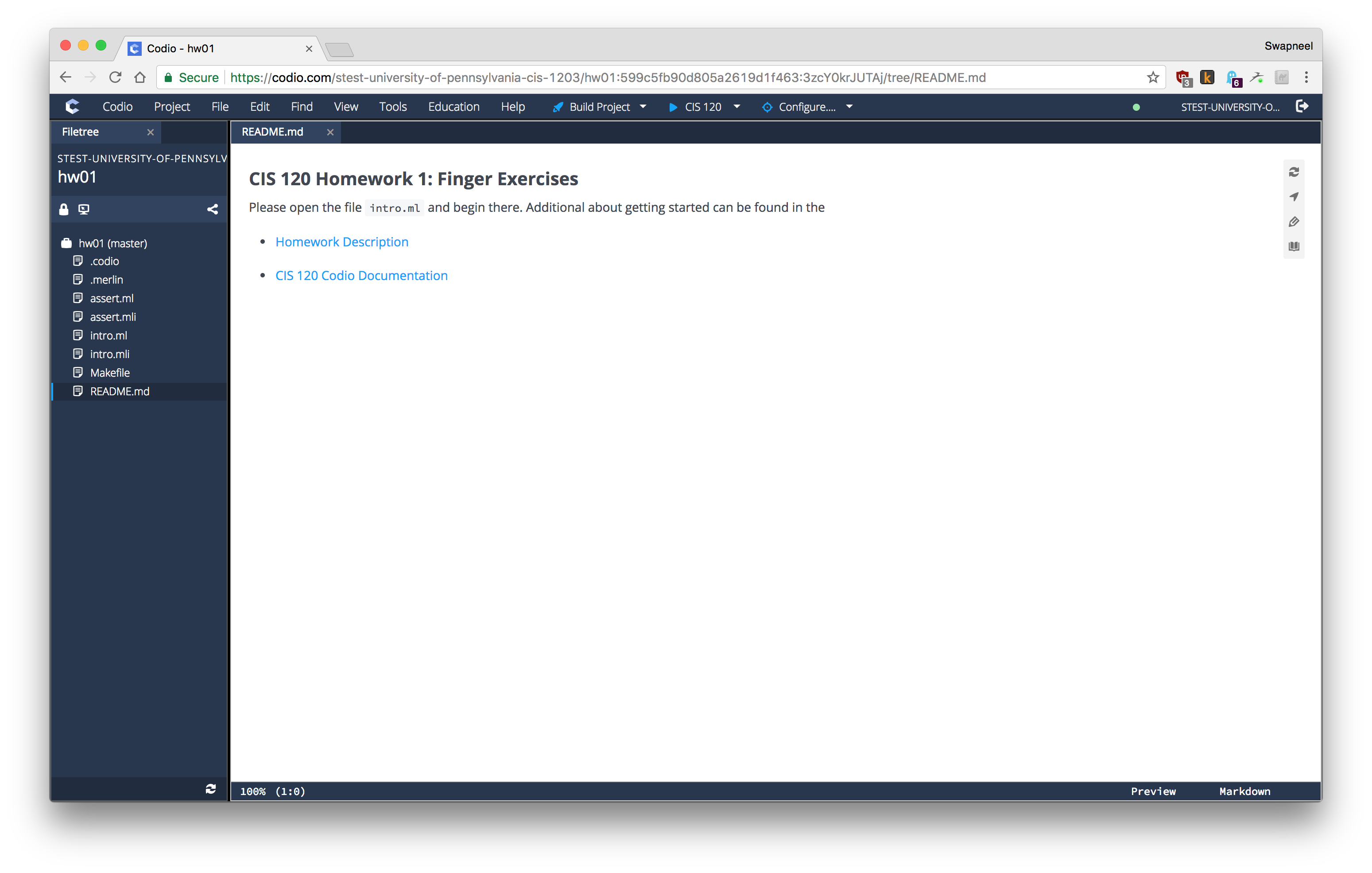 Codio is a web-based integrated development environment (IDE) that allows us to configure a virtual machine with the software needed to complete the CIS 1200 homework assignments. You access Codio through your web browser and use it to create and test homework code. The CIS 1200 teaching assistants will also be able to remotely log in to your workspace to provide help if you need it.