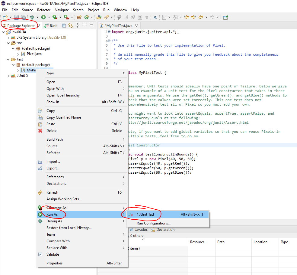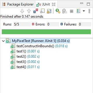 First, annotations before every method in the class are used to indicate the purpose of the method and are designated with the @ symbol. Here, we want to use the above method to test one of the Pixel constructors, so we use @Test to indicate we want JUnit to run it as a test.