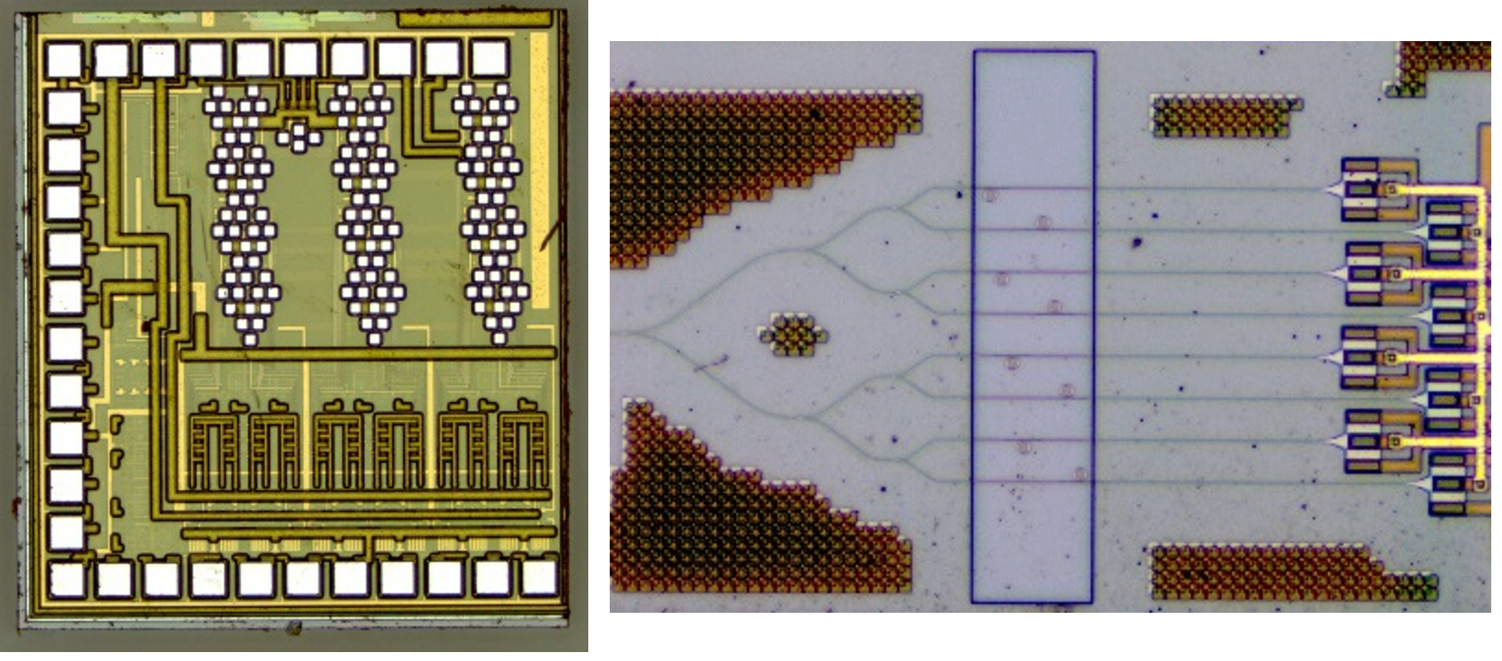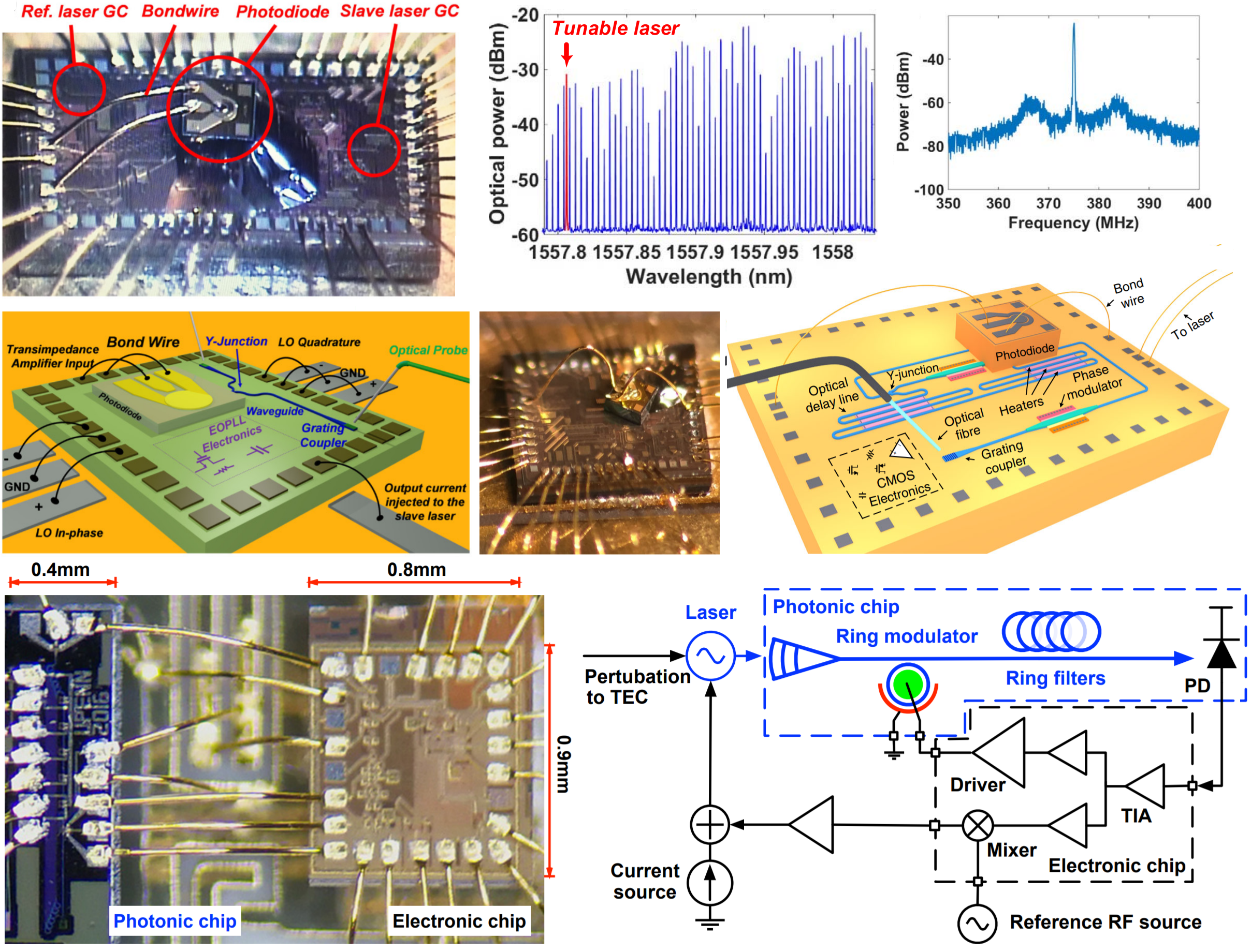 Similarly, use of sophisticated analog, RF, mm-wave, and sub-mm-wave architectures in addition to near-zero incremental cost of transistors in high node technologies can improve the performance of photonic systems. Examples are RF assisted phase noise reduction of semiconductor lasers and electronically controlled laser phased arrays. In the concept of electronic-photonic co-design, combining the advantages of devices, circuits, and architectures in both electronic and photonic domains can profoundly impact both fields resulting in advances in several areas such as communications, signal processing, imaging, and sensing. Under the DARPA DODOS program, we have developed a highly stable optical synthesizer with sub-Hz level resolution across 5THz range. Under this program, we have also demonstrated the first fully integrated Pound Drever Hall (PDH) laser stabilization system in CMOS. Under DARPA MOABB program, we are working towards implementation of 2D optical phased arrays with sub-wavelength element size and spacing. Under NASA Early Stage Innovations program, we are working on implementation of omni-directional free-space near-earth satellite communication links using such optical phased arrays. As an example of photonic assisted electronics, under DARPA photonic assisted integrated ultra-low phase noise clock (Pi-UPNC), we are working towards highly-stable spectrally pure RF signal generation using highly stabilized phase locked lasers.