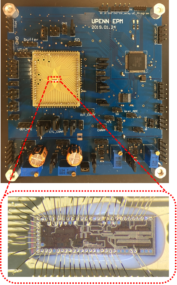 Machine learning for on-chip neural signal processing-Brain-machine-interface (BMI) plays a significant role in understanding the brain and treating diseases such as epilepsy, Parkinson’s, Alzheimer’s, etc. Next-generation BMI requires an ultra-low power chip to precisely process neural signals and decrease the wireless data bandwidth thus enabling high recording channel-count while preventing tissue damage caused by heat dissipation. A specific processing task performed on extra-cellularly recorded neural signal is spike sorting, which distinguishes the firing activities of multiple neurons based on the difference between their electrical waveforms. By integrating all of the essential blocks on a CMOS chip, including signal conditioning, feature extraction and classification, we are working toward a self-contained spike sorter that bridges between the raw extra-cellular neural signals and the single neuron activities. Featuring a novel classification algorithm and its analog implementation, the spike sorter chip is expected to achieve high accuracy at an ultra-low power consumption.